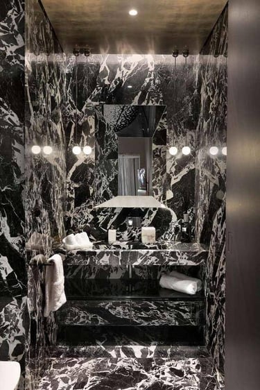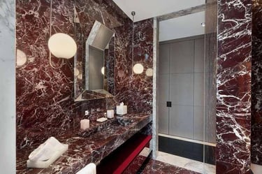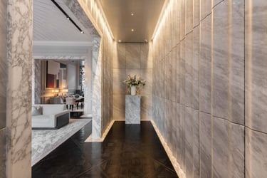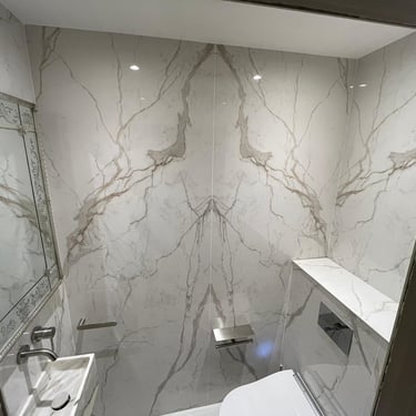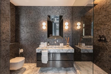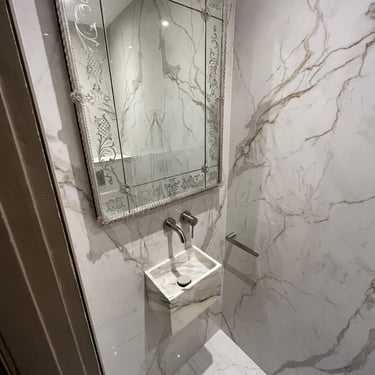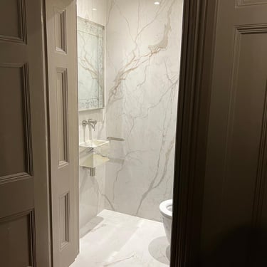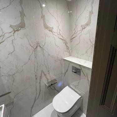 We transformed a compact cloakroom in Albert Court into a statement of refined elegance. Using beautifully book-matched tiled slabs, the space achieves perfect visual symmetry and a sense of sophistication. The addition of a TOTO electronic toilet enhances both comfort and functionality, blending modern technology with timeless design. Through meticulous expertise, we turned a small, enclosed area into a bright, luxurious space that feels effortlessly expansive and refined.